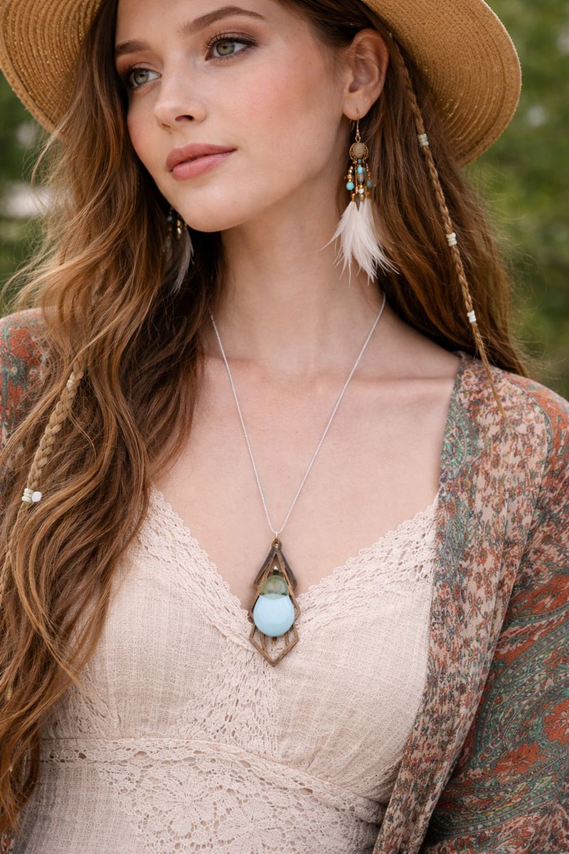 This unique necklace features a beautiful blue glass pendant with a design that incorporates nature, art, beach themes, and elements of magic and fantasy.