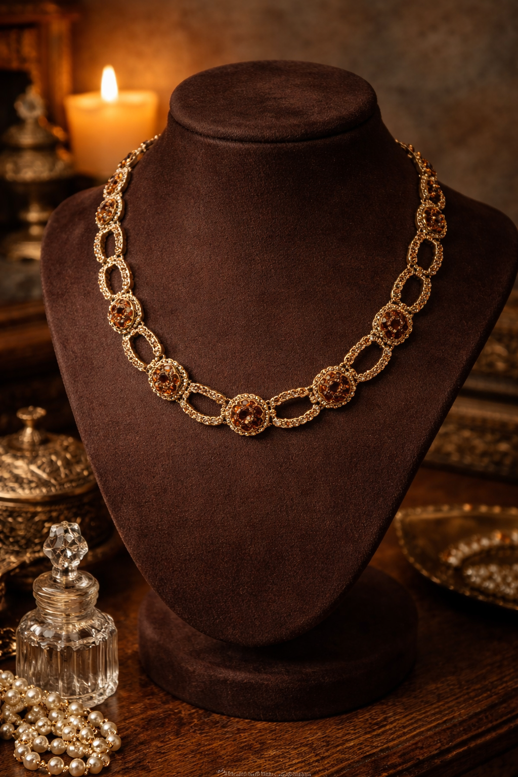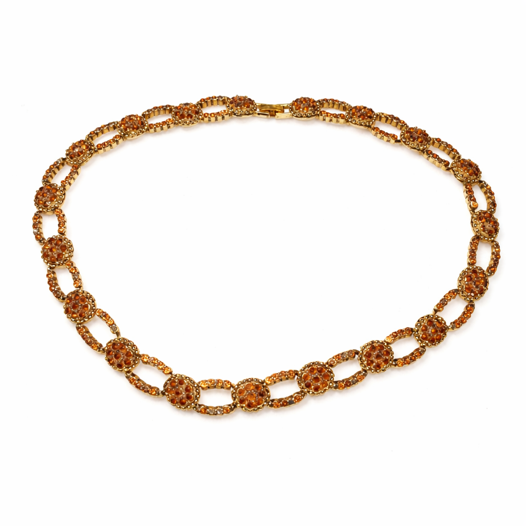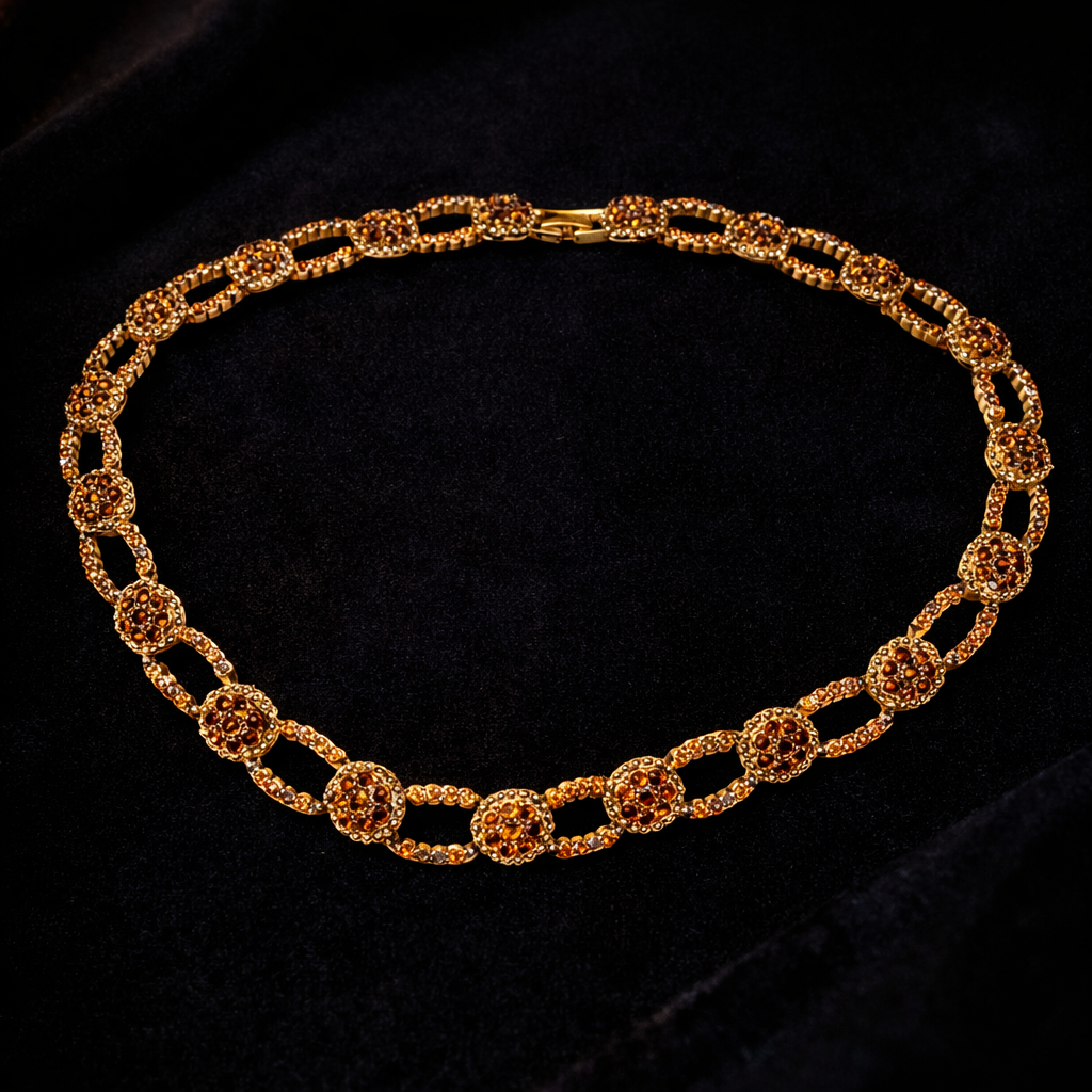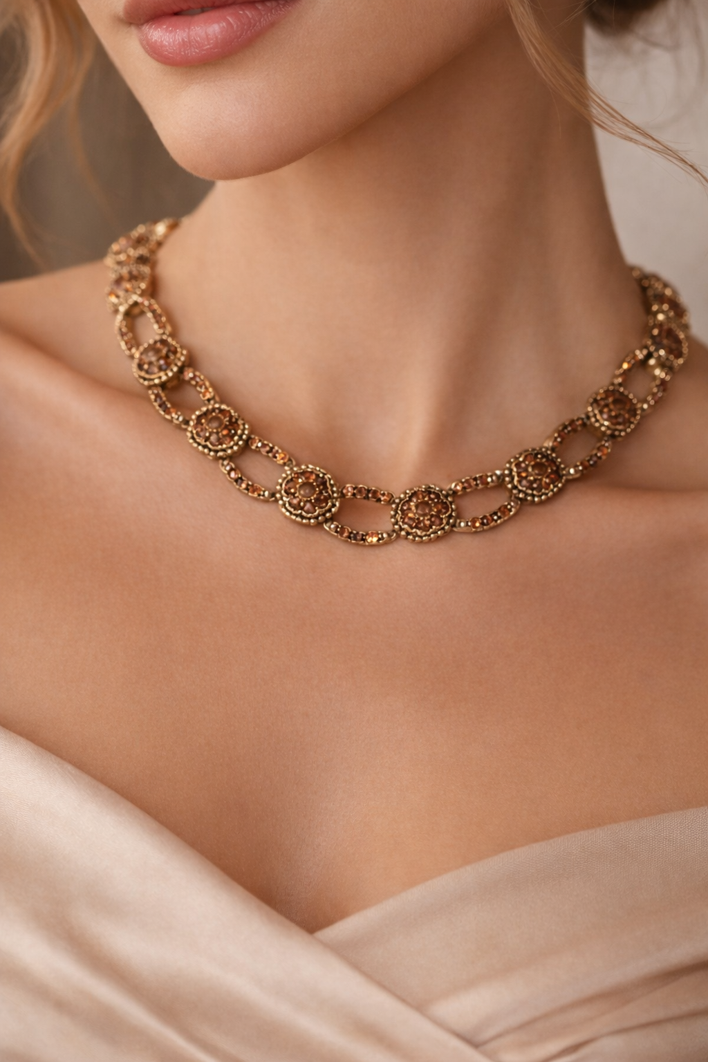 Beautiful elegant necklace with a sophisticated design, perfect for special occasions or to elevate any classic or modern outfit. This necklace features a delicate structure of interlinked circular elements, each adorned with amber-colored crystals that reflect light in a subtle and refined way.