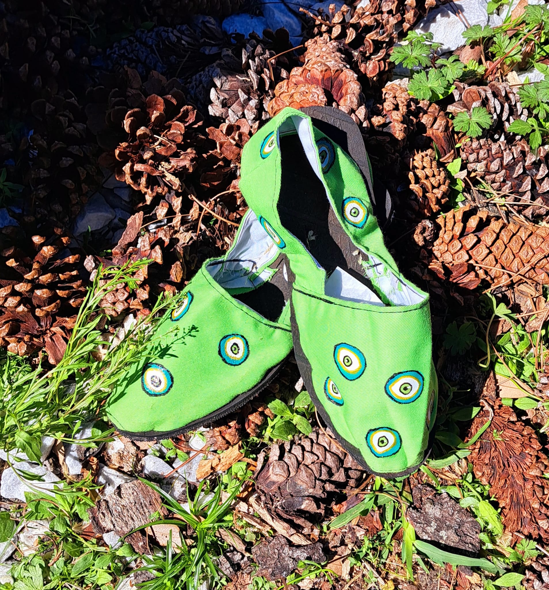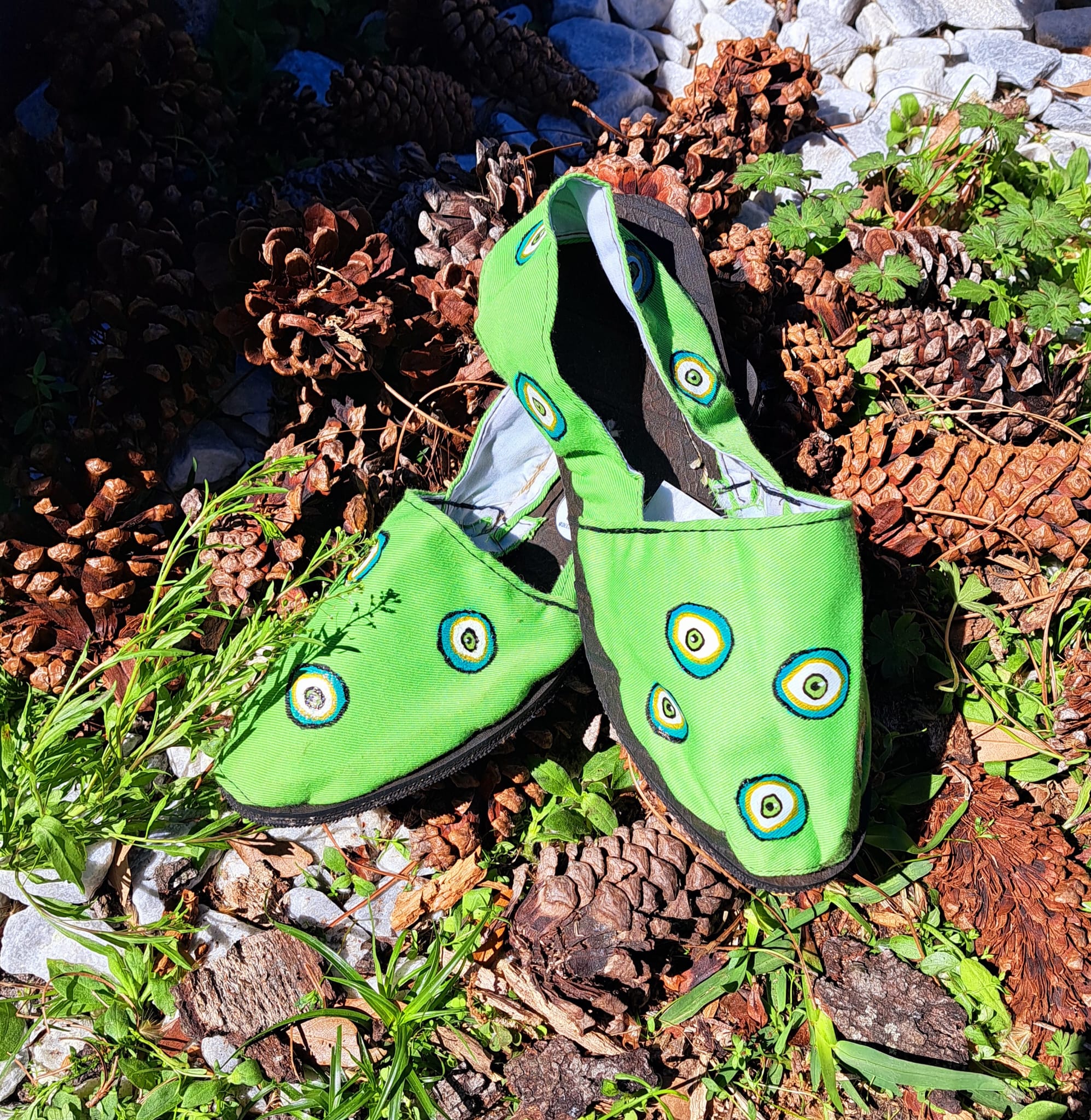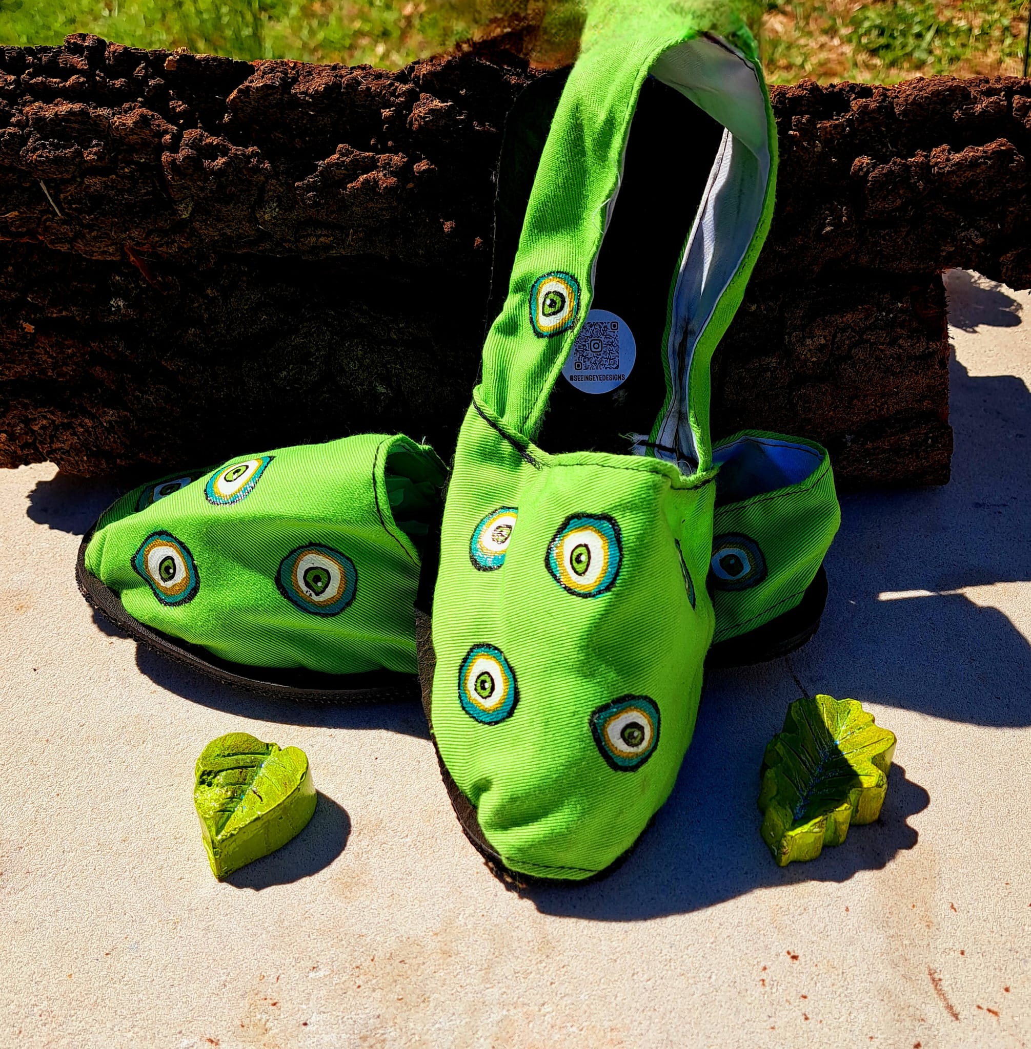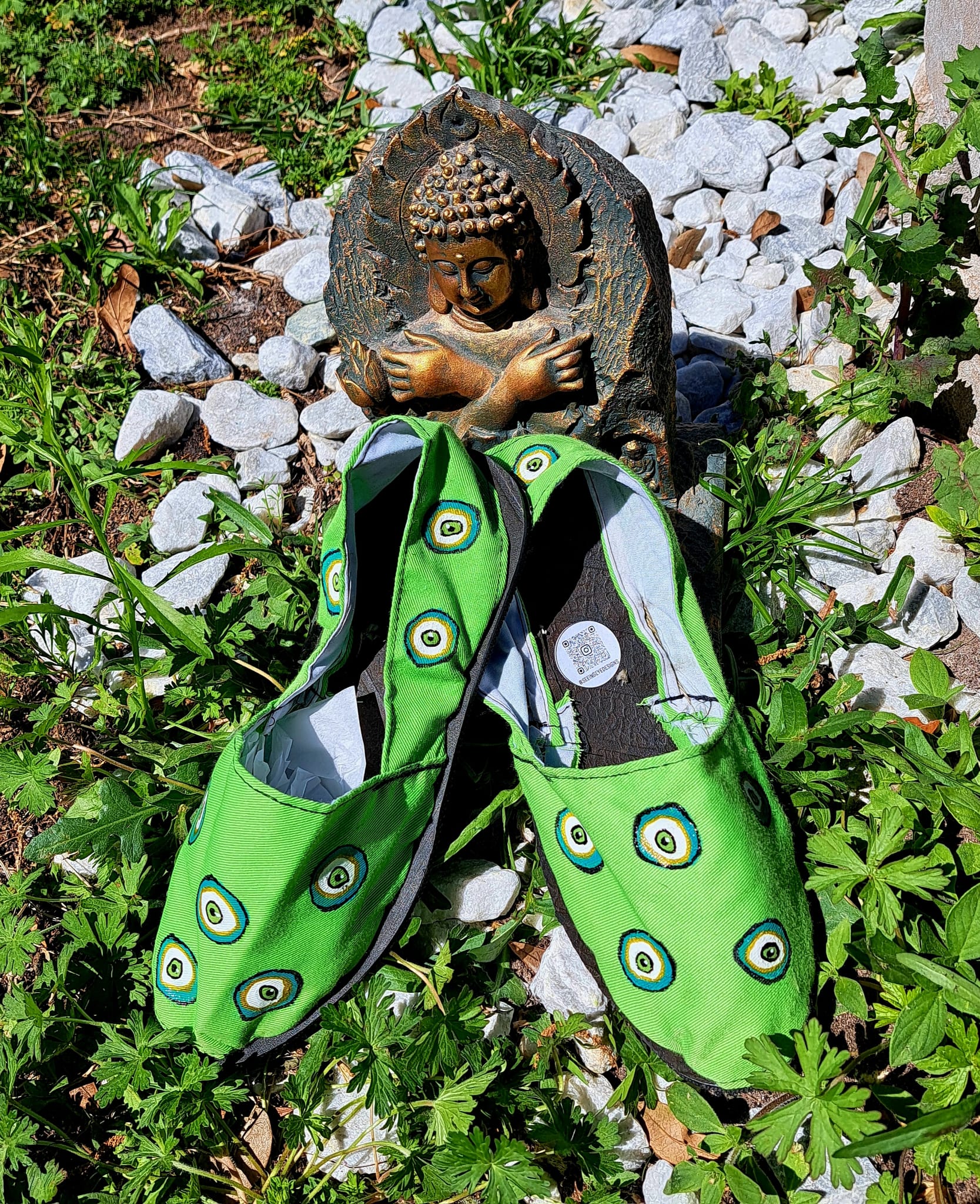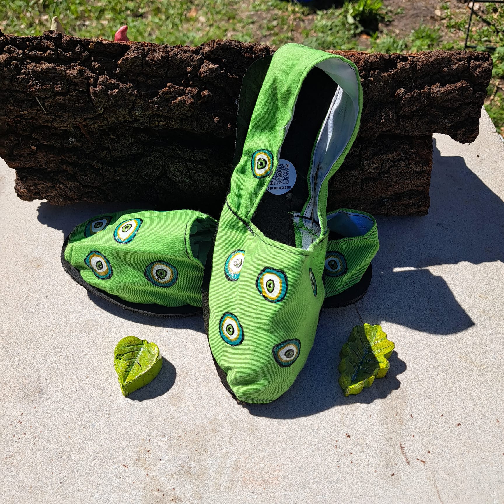 Add a bold, artistic touch to your wardrobe with these unique hand-painted boho espadrilles, carefully crafted to stand out. Each pair features a vibrant green fabric base decorated with hand-painted circular mandala-inspired details, making every shoe truly one of a kind.