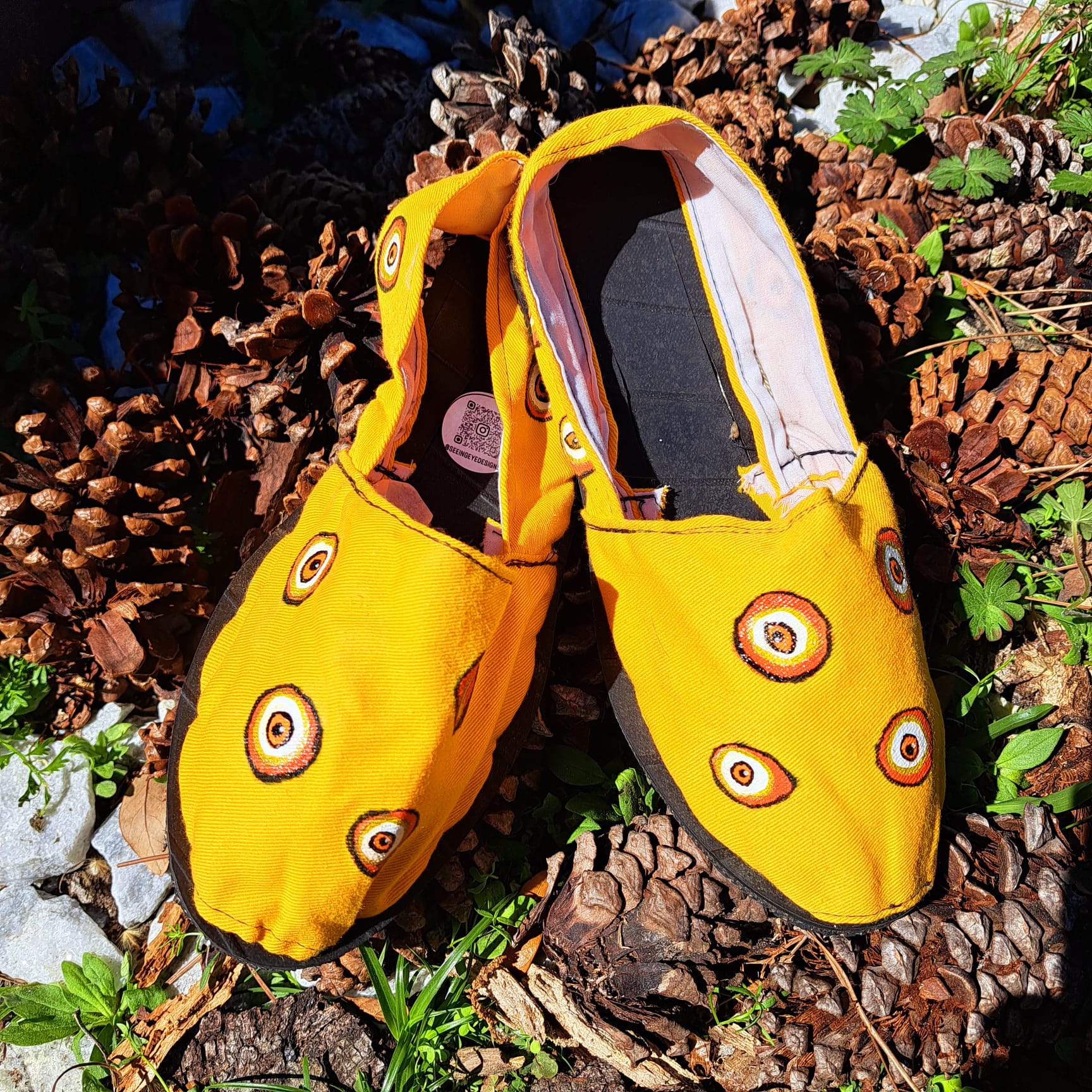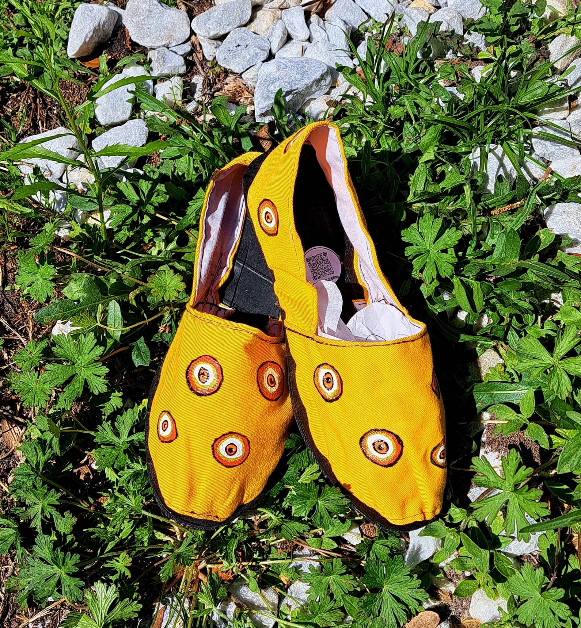 Brighten your style with these stunning hand-painted boho espadrilles in vibrant yellow, designed to make a statement. Featuring the same signature mandala-inspired circular pattern, each pair is carefully painted by hand, ensuring a truly unique and artistic finish.