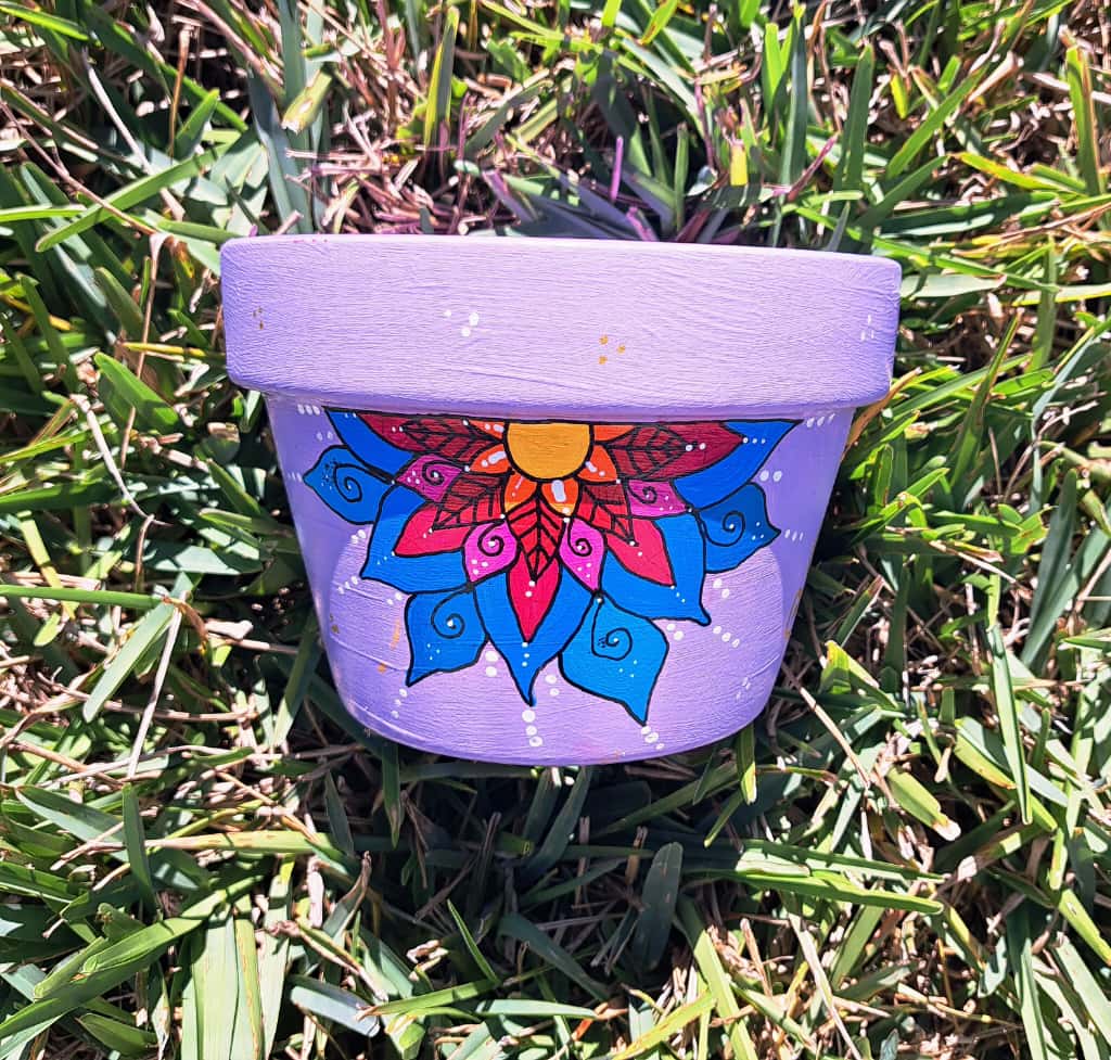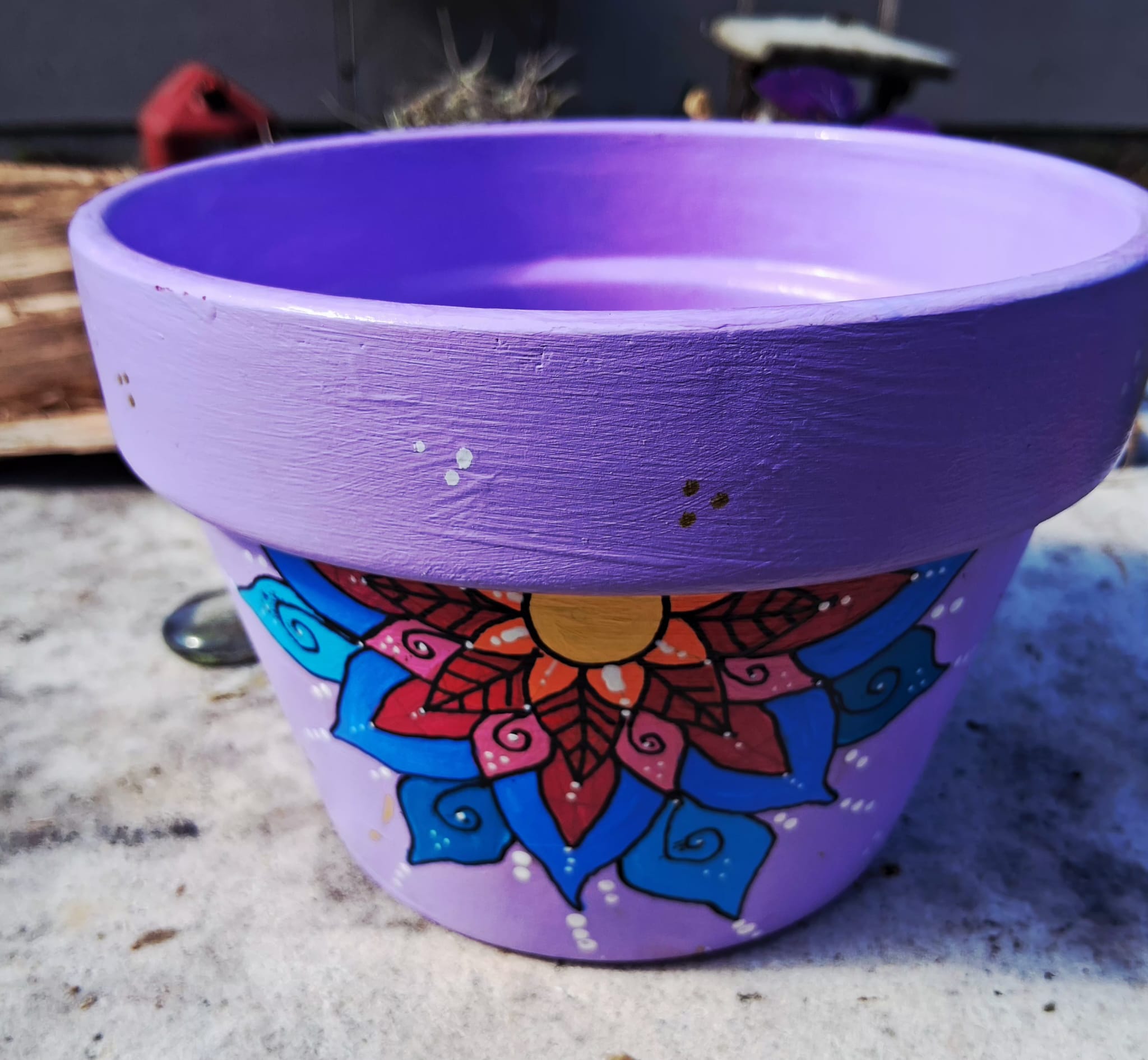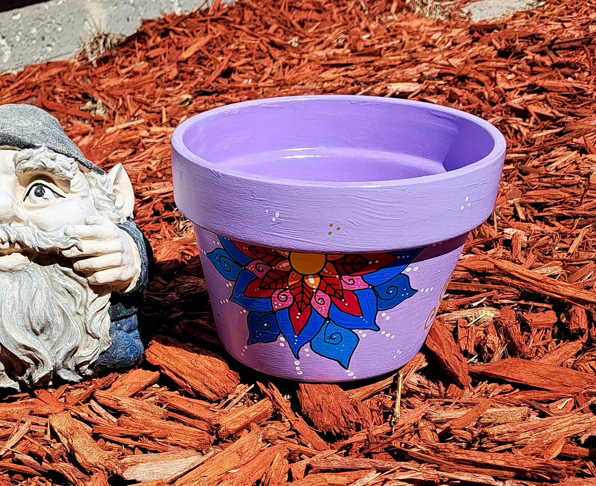This pot features a stunning mandala design in bold red, blue, and gold tones over a soft lavender background. Every brushstroke is intentional, creating a radiant, symmetrical mandala that symbolizes balance, harmony, and creativity. The bright colors pop beautifully against the smooth matte finish, making this pot a standout piece in any room or garden.