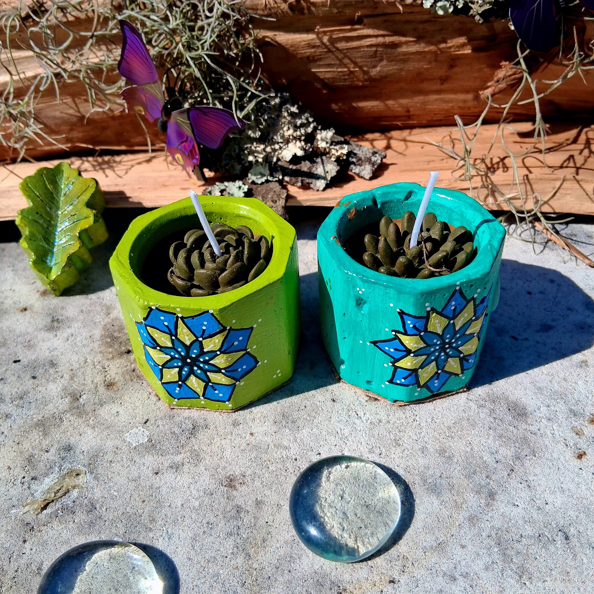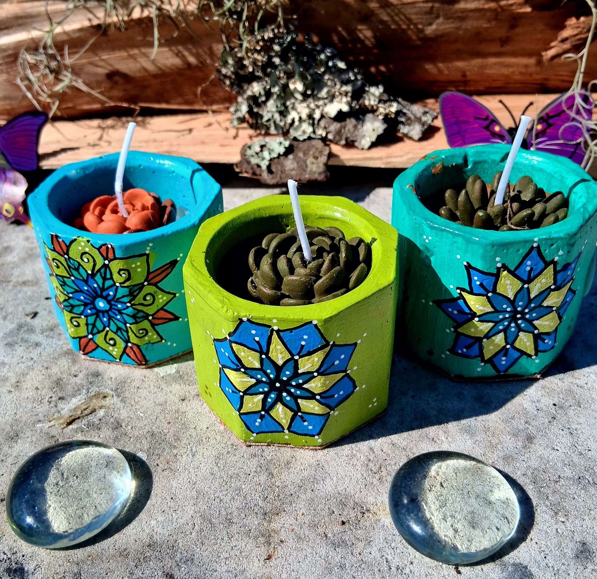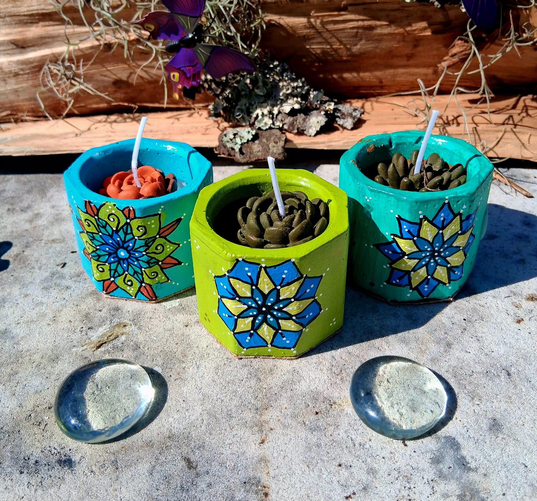 Bring light, color, and positive energy into your space with this beautiful set of three handcrafted succulent candles, each displayed in a hand-painted cement pot featuring vibrant, original mandala designs by Seeing Eye Designs.