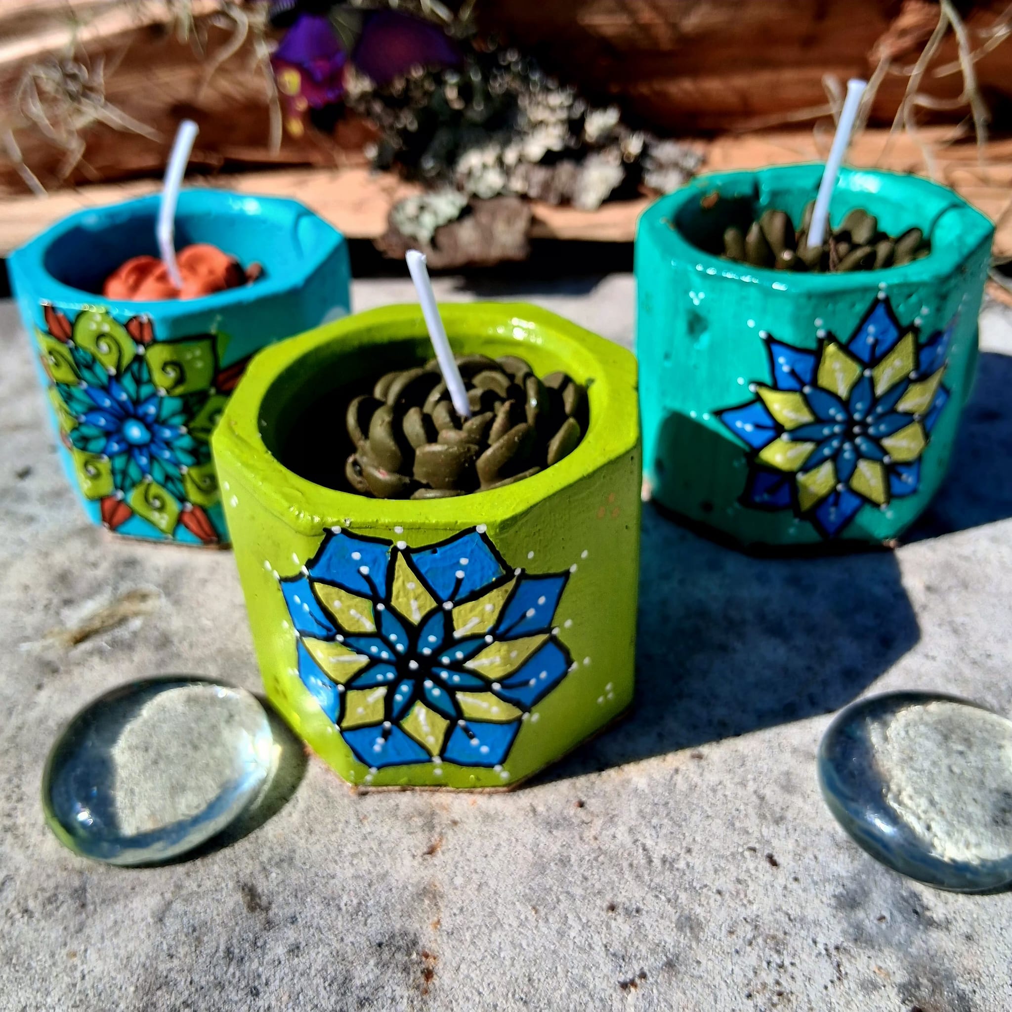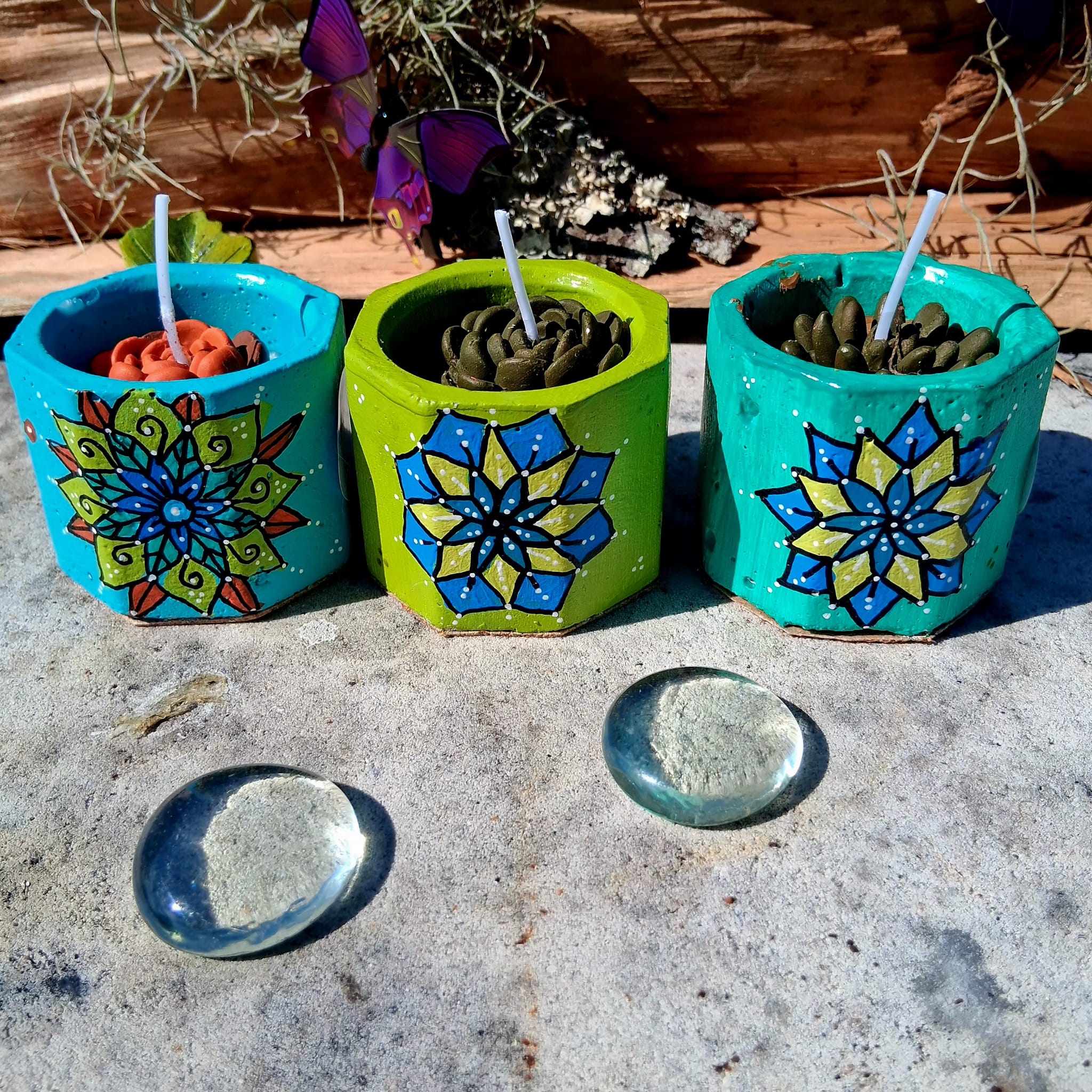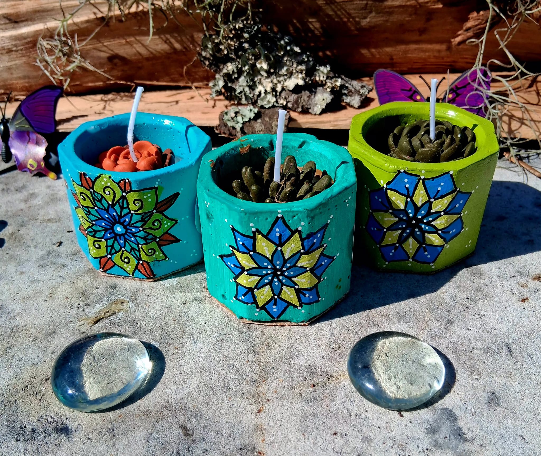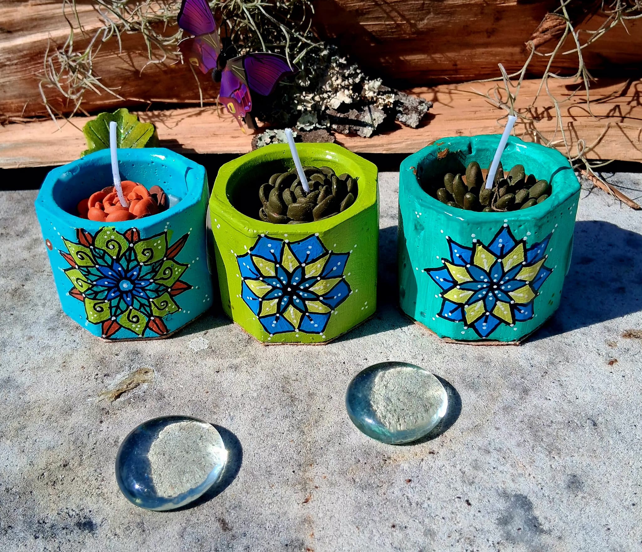Bring light, color, and positive energy into your space with this beautiful set of three handcrafted succulent candles, each displayed in a hand-painted cement pot featuring vibrant, original mandala designs by Seeing Eye Designs.