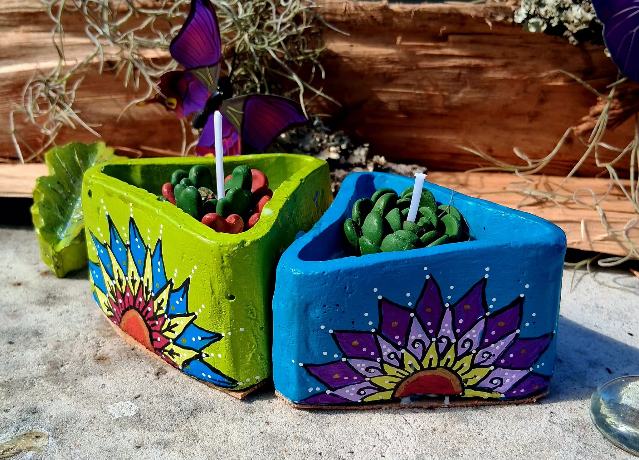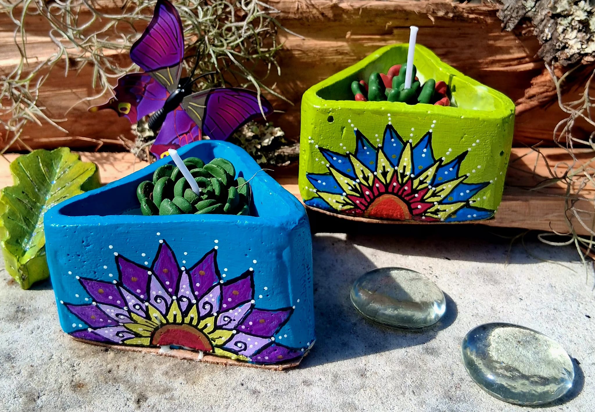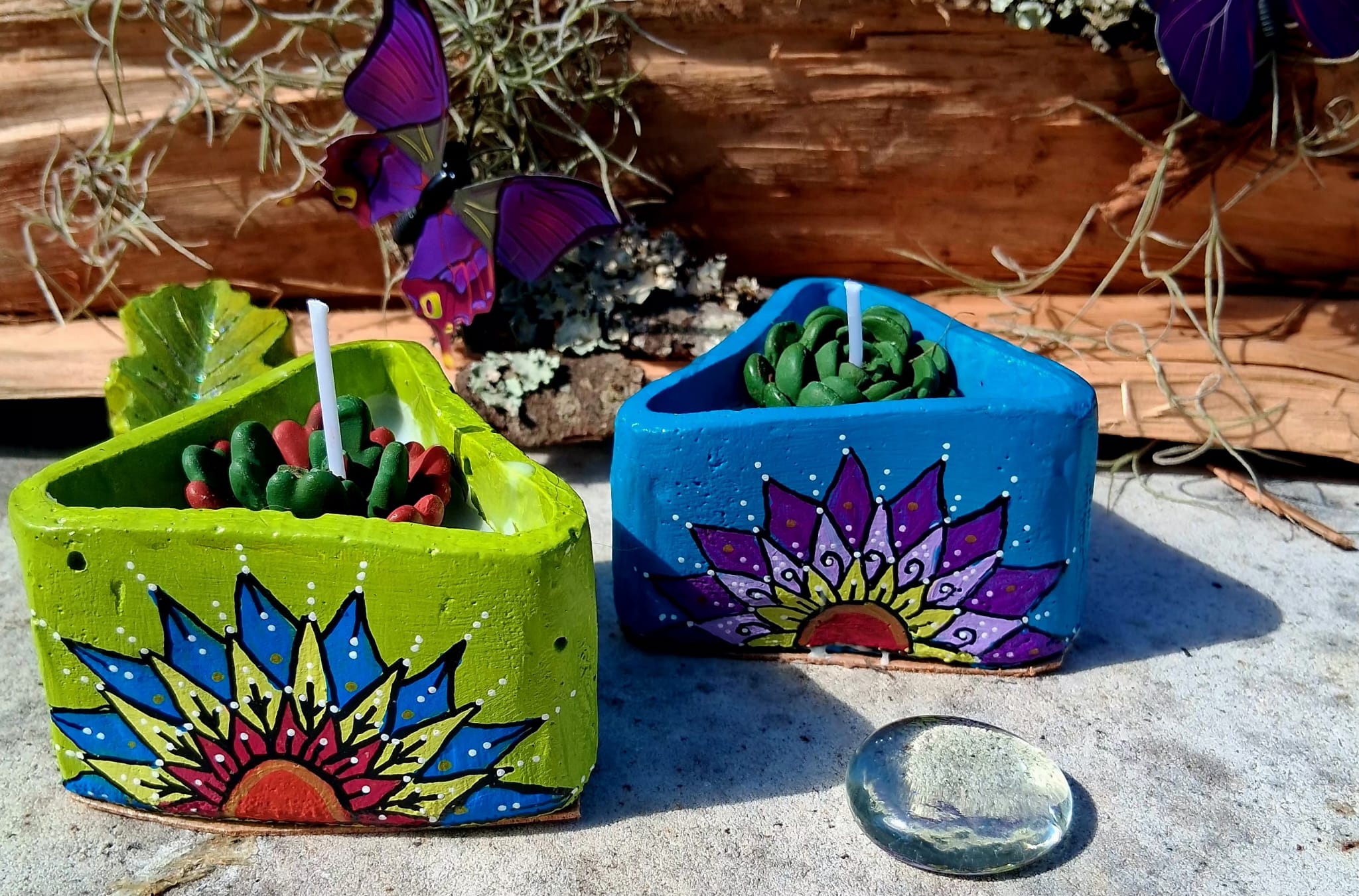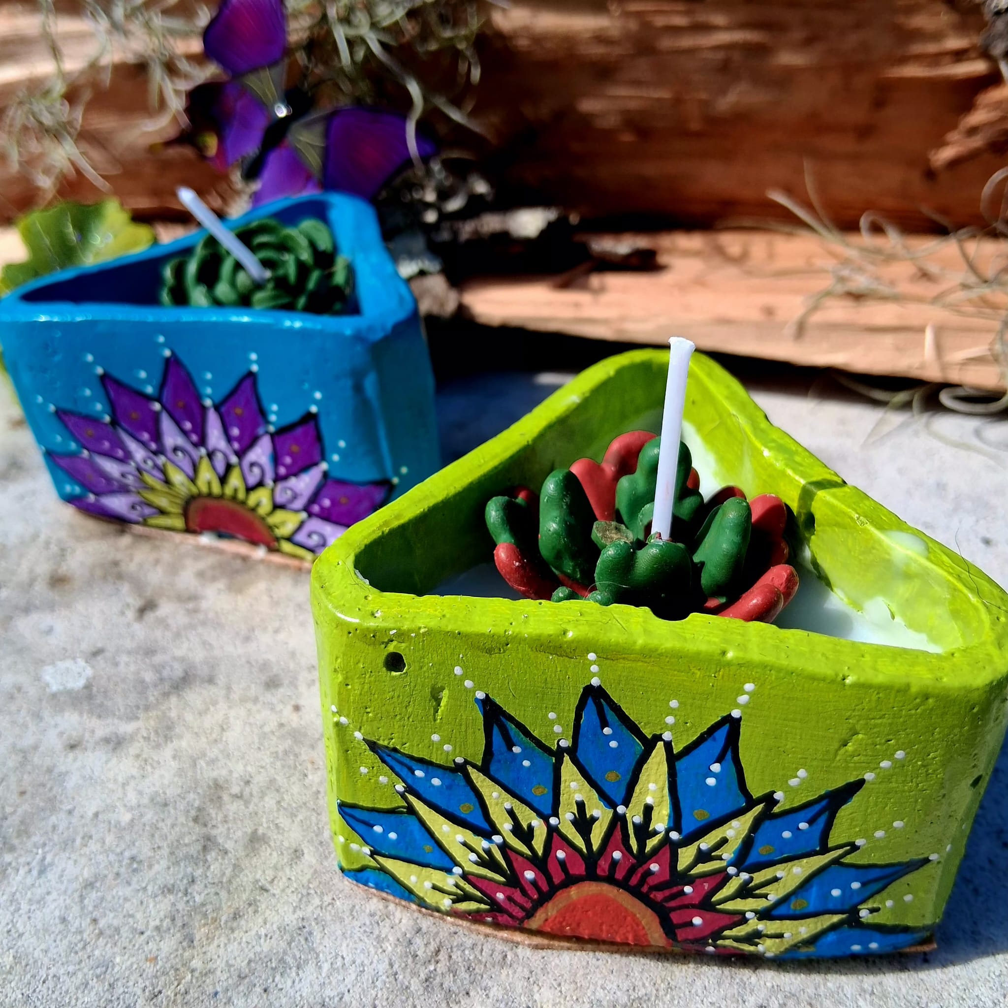Bring color, positivity, and artistic charm into any space with these hand-painted triangular candle holders, each featuring a bright mandala design and a mini succulent candle. These pieces blend bohemian style with artisan craftsmanshipโperfect for home dรฉcor lovers, gift-givers, and anyone who enjoys unique handmade art.