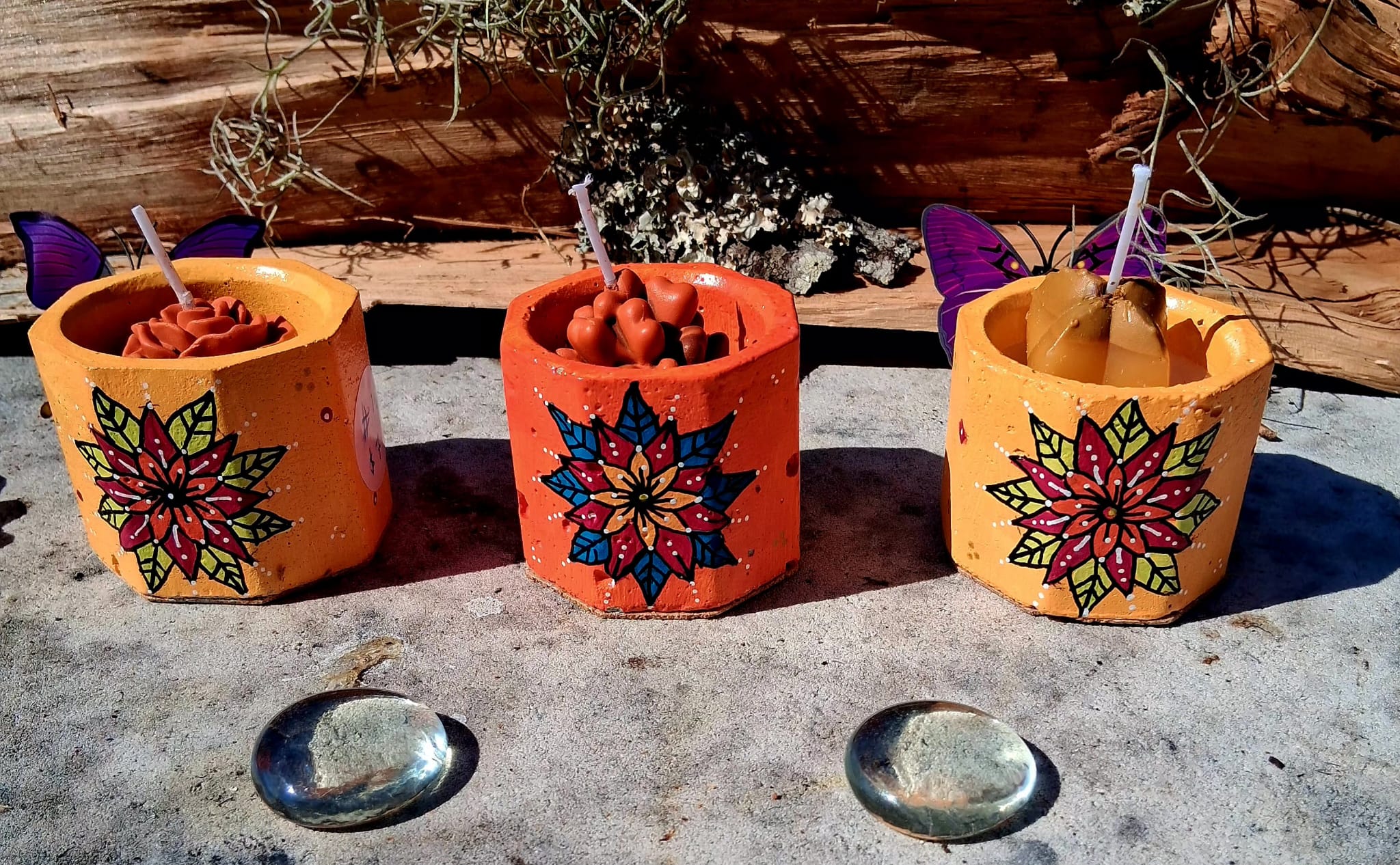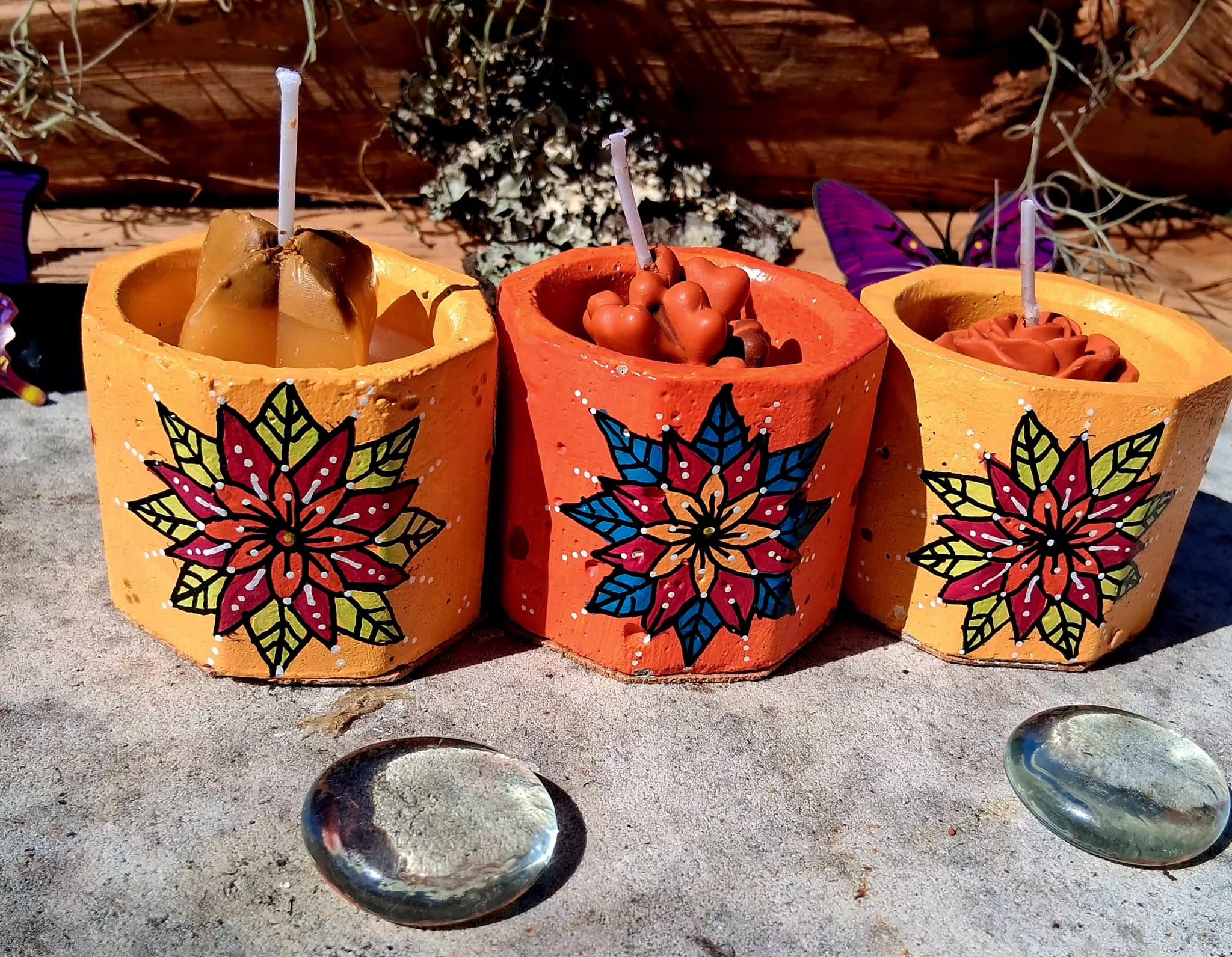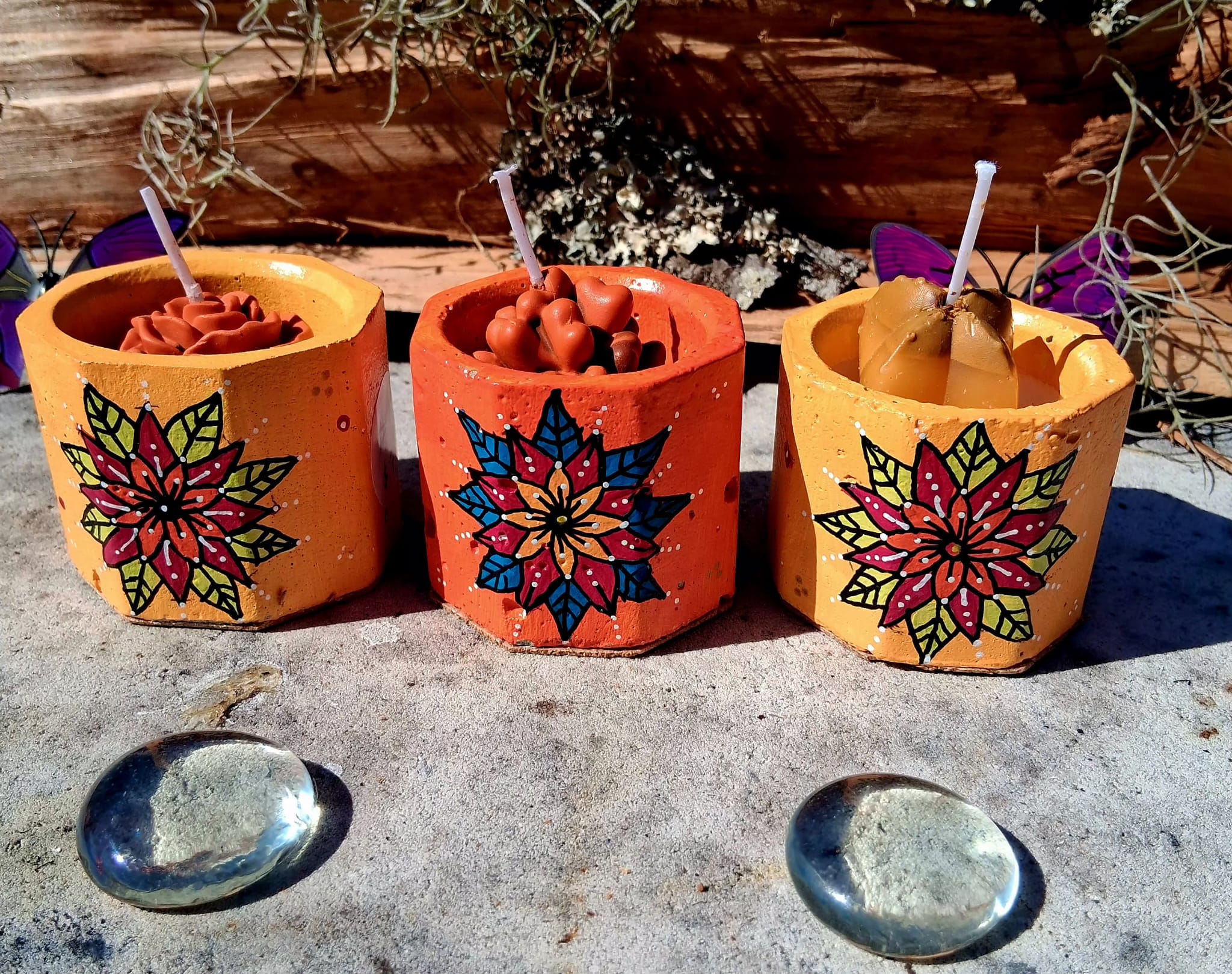 Bring light, color, and positive energy into your space with this beautiful set of three handcrafted succulent candles, each displayed in a hand-painted cement pot featuring vibrant, original mandala designs by Seeing Eye Designs.